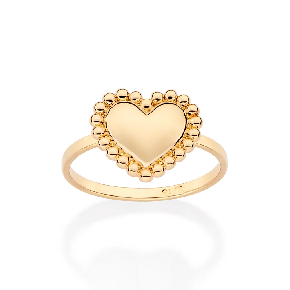 Anel skinny com coração liso abaulado com esferas ao redor.